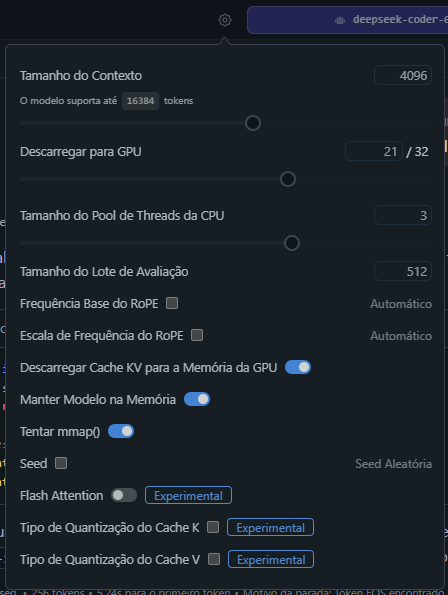 Descarregar para GPU (GPU Offload): A configuração mais crucial. Aumente este valor para usar o poder da sua placa de vídeo e acelerar drasticamente as respostas. Carregue o máximo de camadas que sua VRAM permitir.