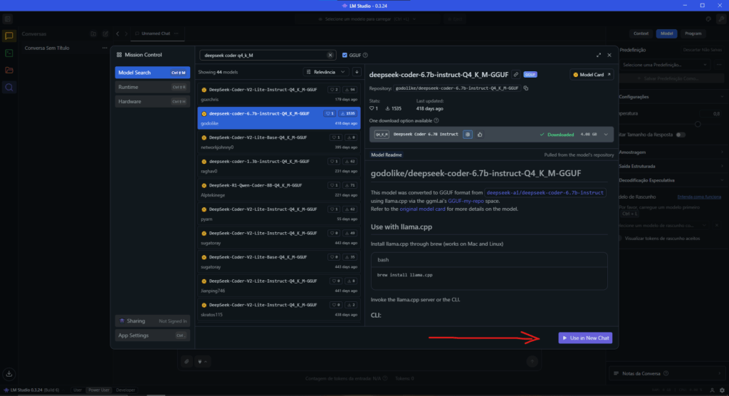 Abra o LM Studio. Na tela principal (ícone de 🔍), procure por “deepseek coder“. Você verá várias versões no formato GGUF.